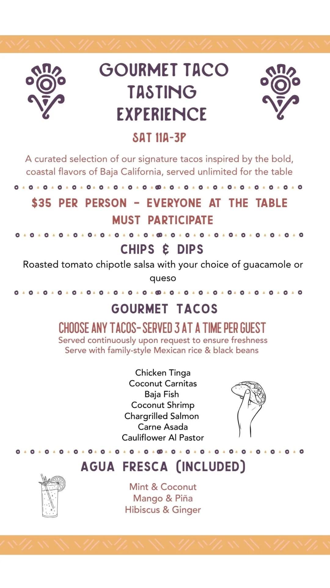 Unlimited Gourmet Tacos: A continuous selection of chef-crafted tacos served upon request, featuring favorites like the Baja Fish, Coconut Shrimp, Carne Asada, Chicken Tinga, and Cauliflower Al Pastor, all paired with Mexican rice and black beans.